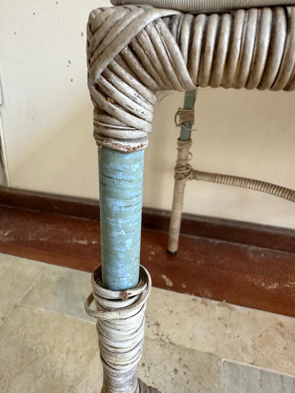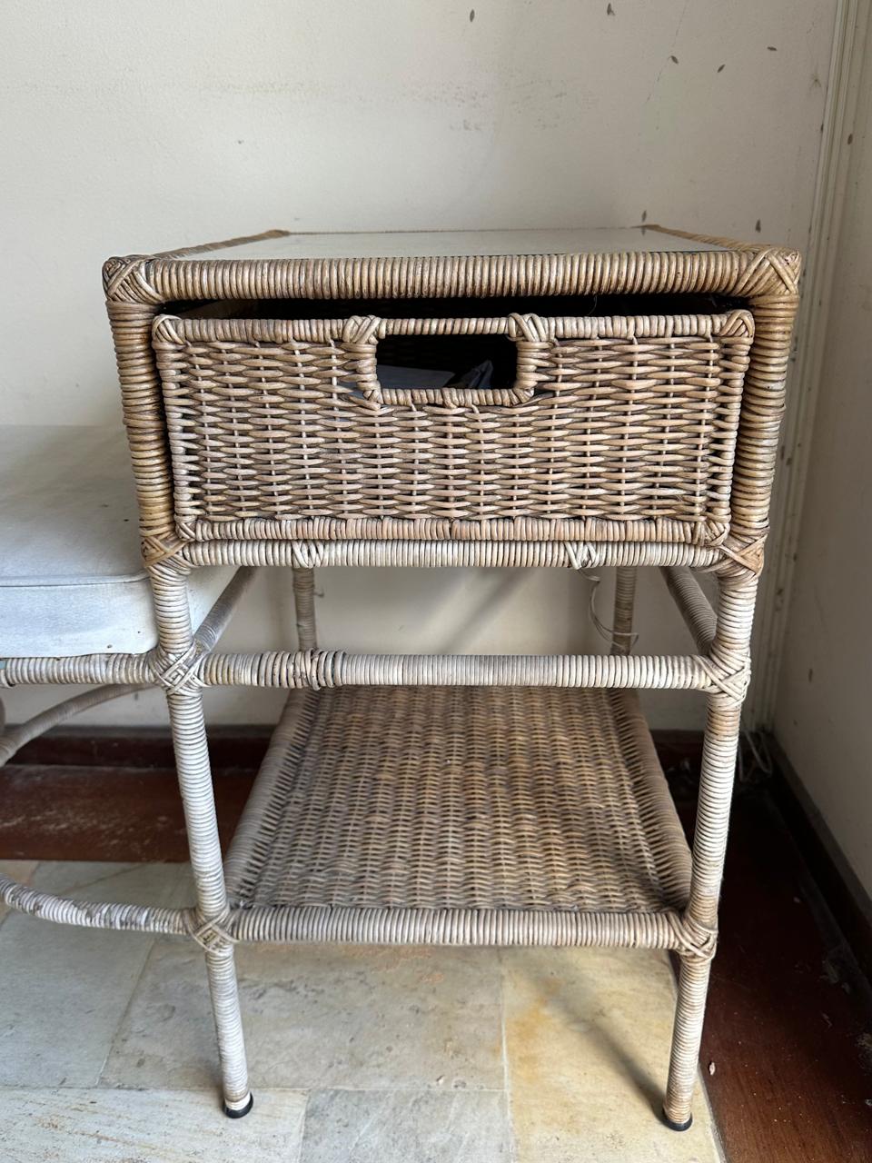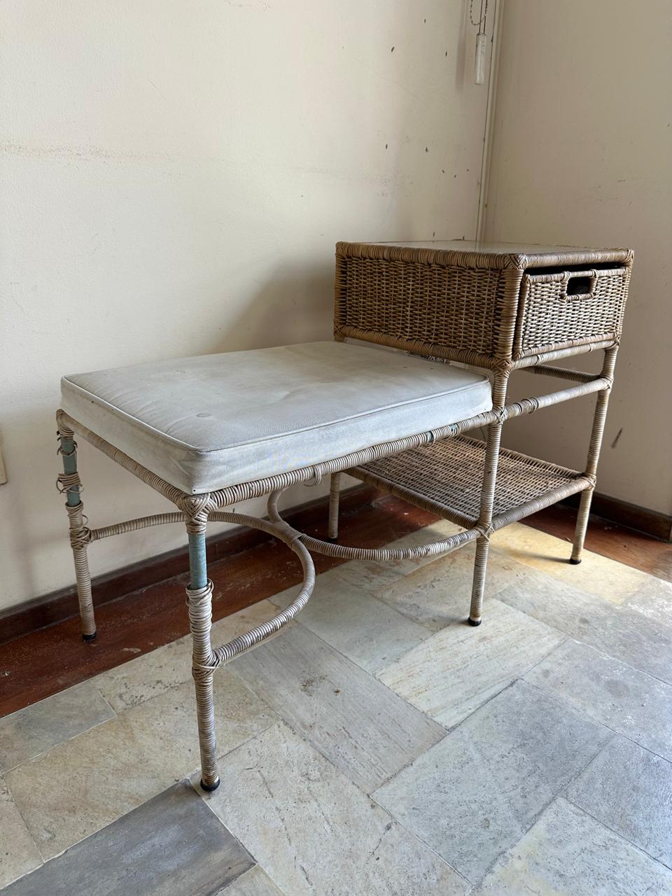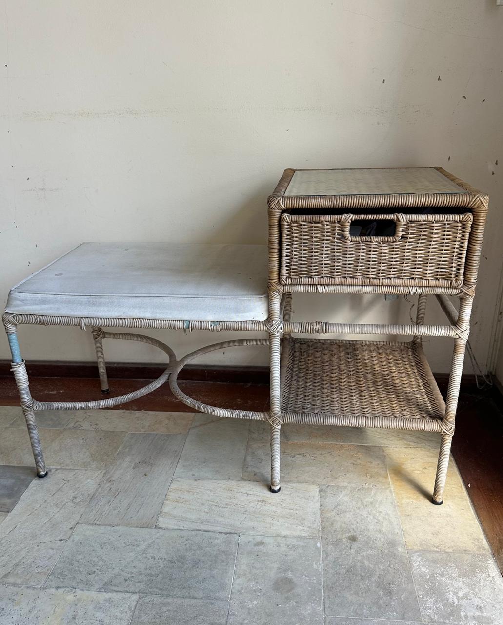 QUEM LEMBRA ? — MESINHA DE TELEFONE — FERRO + RATTAN NATURAL — COM GAVETINHA E ALMOFADA — A FIBRA JÁ ESTÁ PRECISANDO DE RECUPERAÇÃO EM ALGUNS PONTOS E A ALMOFADA UMA LIMPEZA — F064.14
