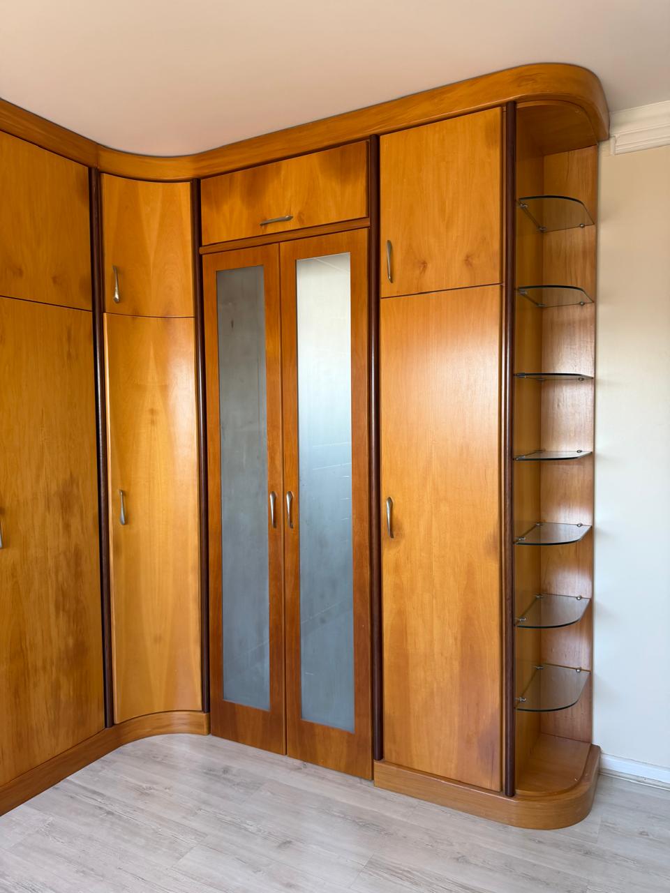 ROUPEIRO COM MALEIRO + SAPATEIRA EXTERNA – MADEIRA + LÂMINA DE MADEIRA – PAREDE EM L – PORTA CENTRAL DE ACESSO A BANHEIRO — D038.106