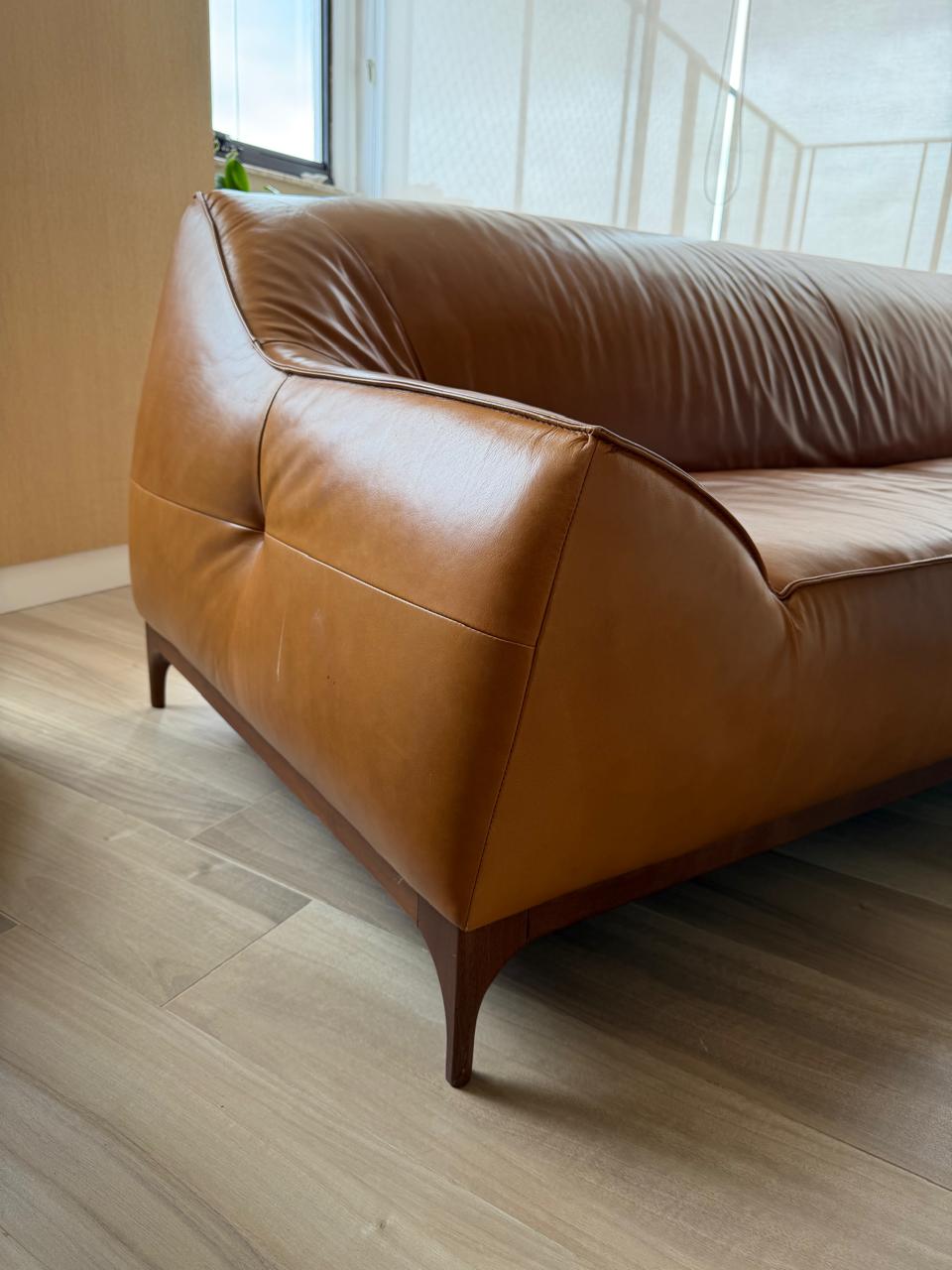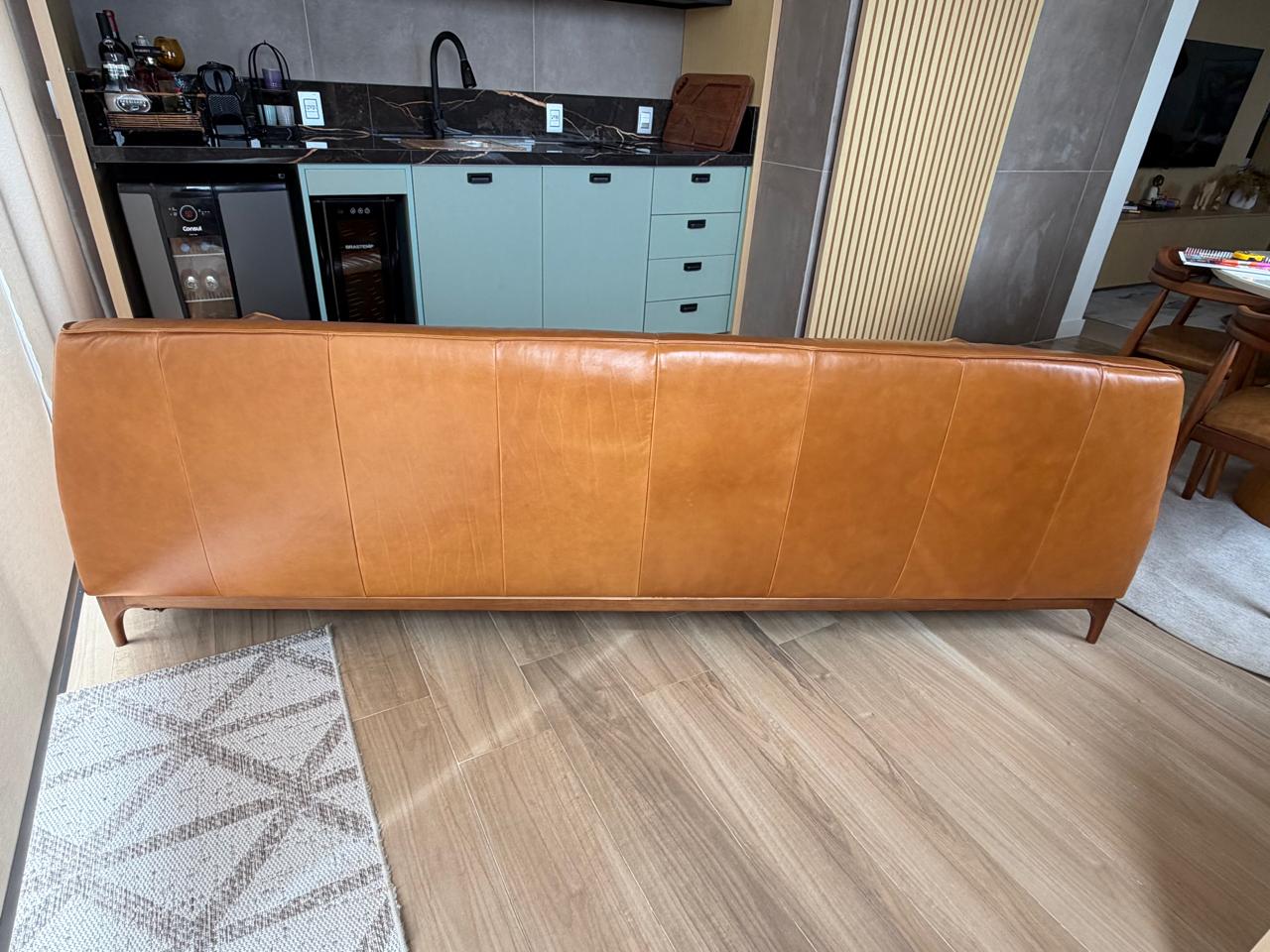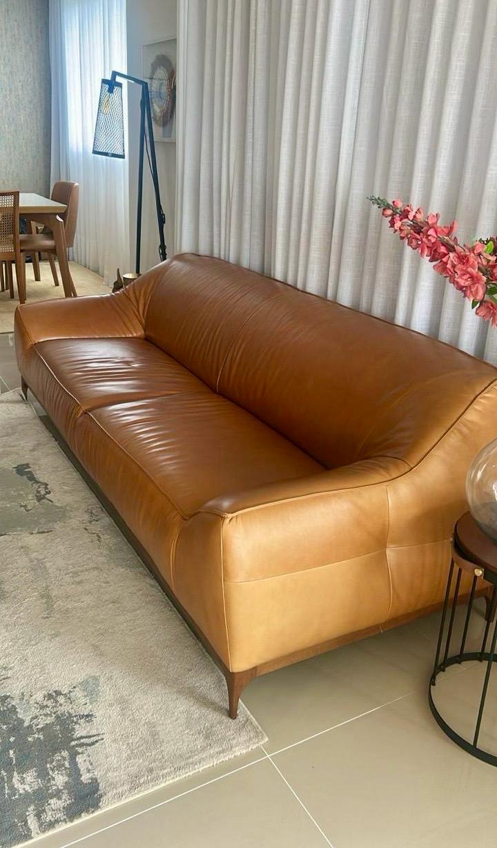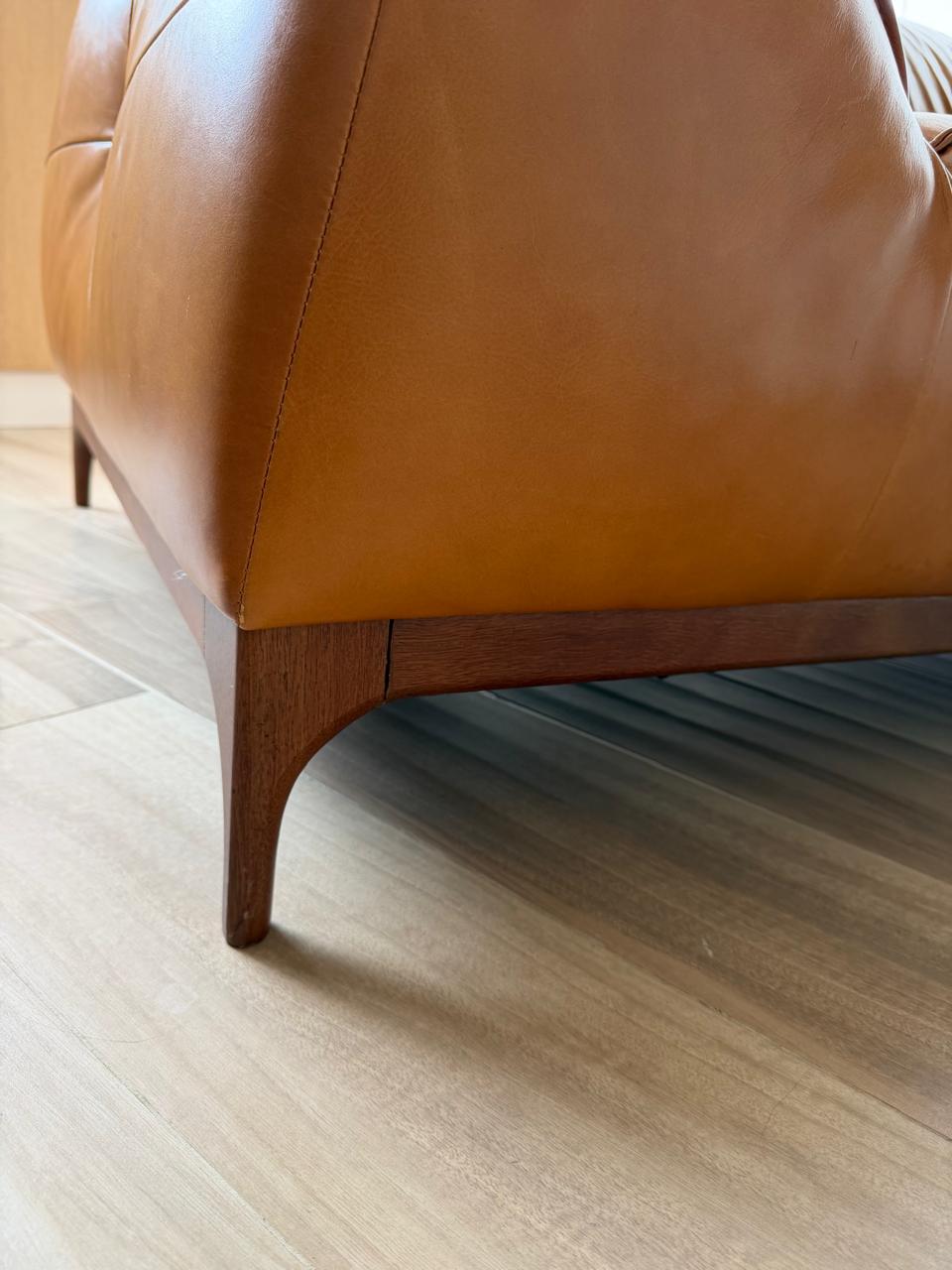 SOFÁ DE COURO CARAMELO – ESTRUTURA E PÉS DE MADEIRA – ACETINADO — E032.01