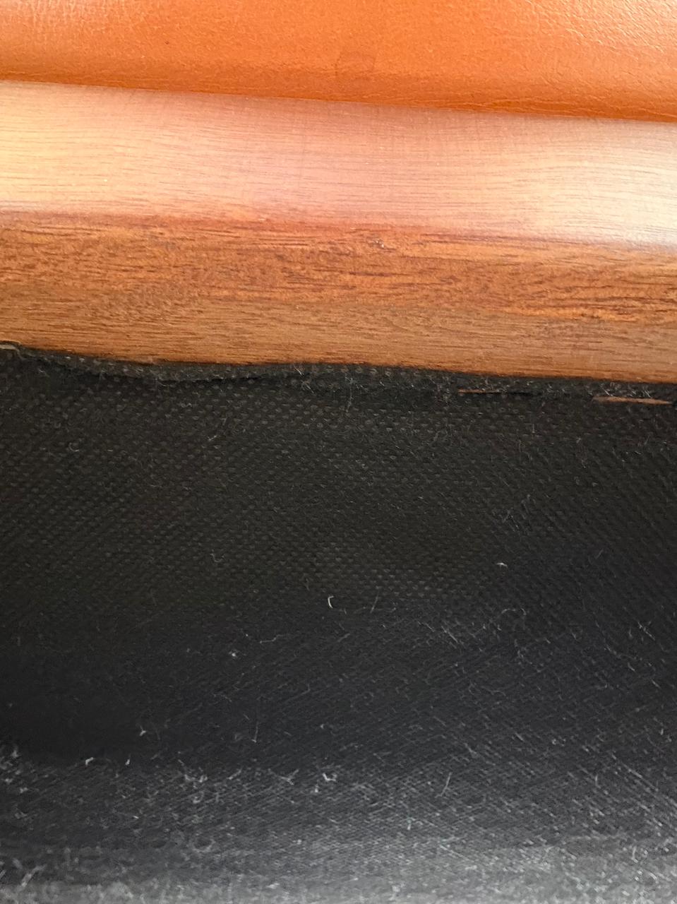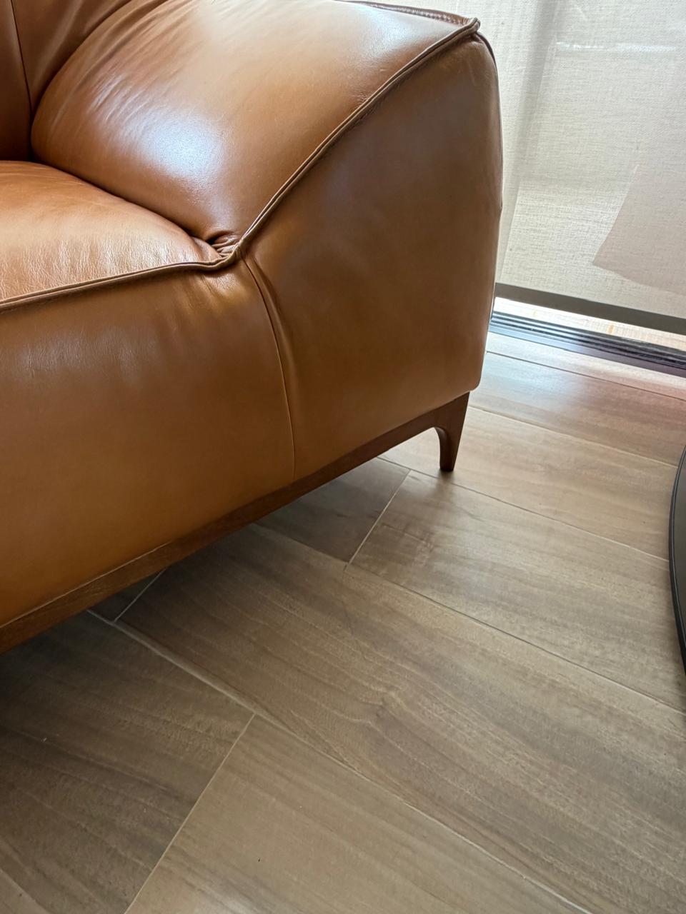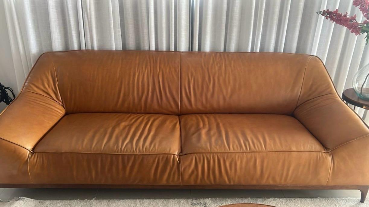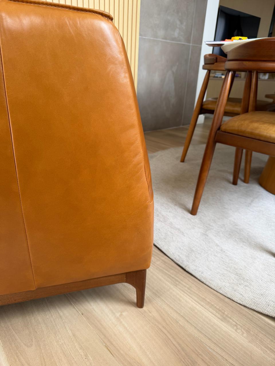 SOFÁ DE COURO CARAMELO – ESTRUTURA E PÉS DE MADEIRA – ACETINADO — E032.01