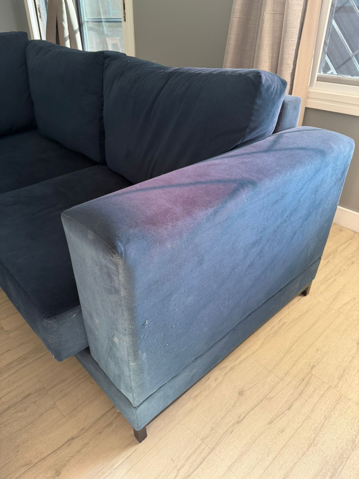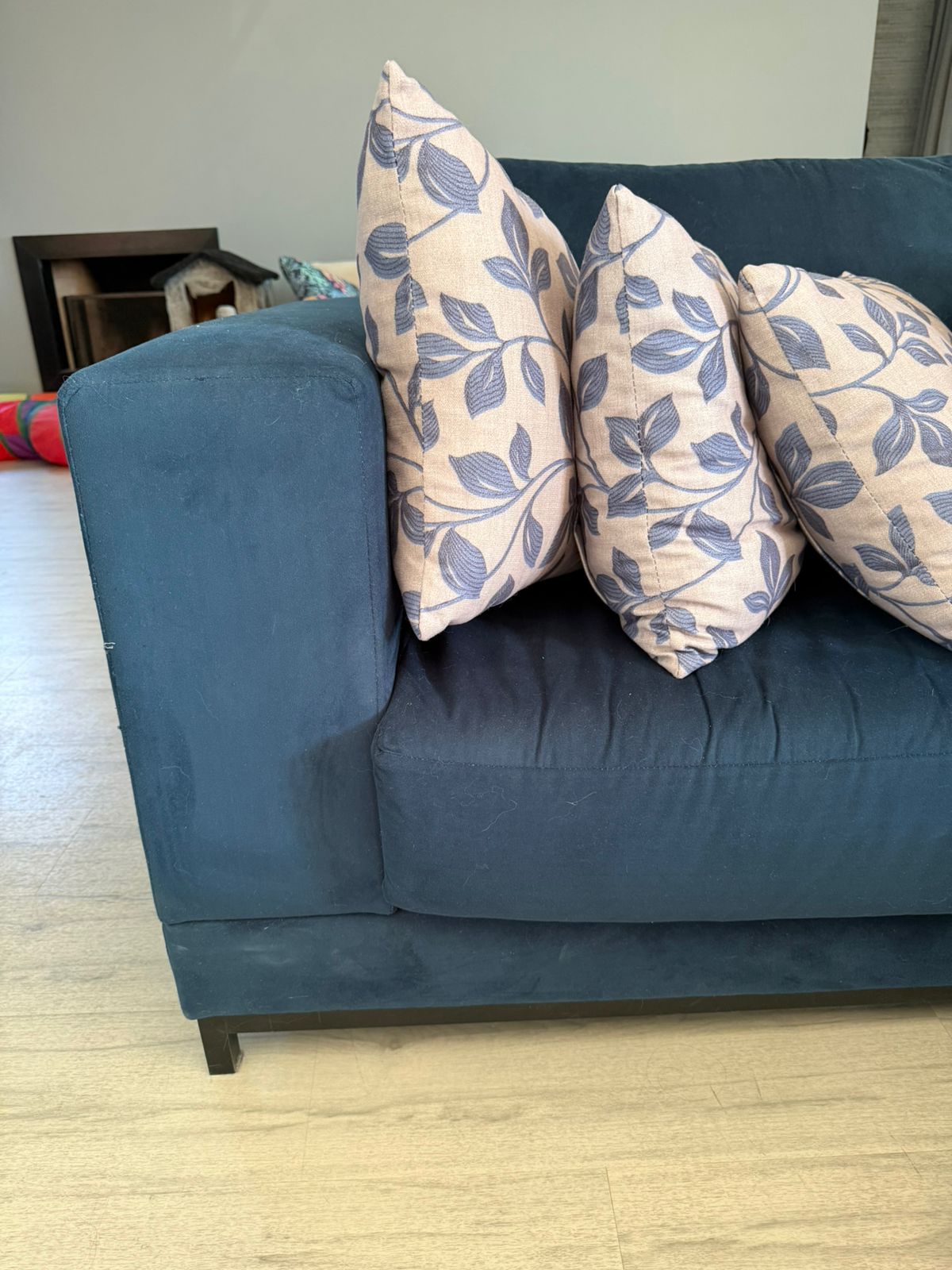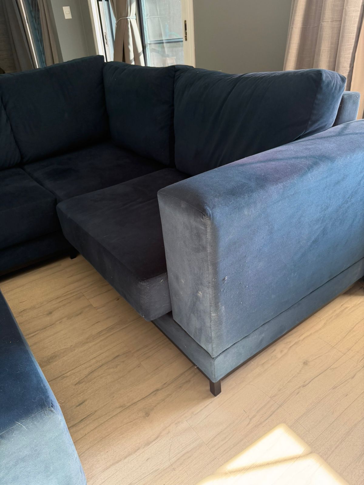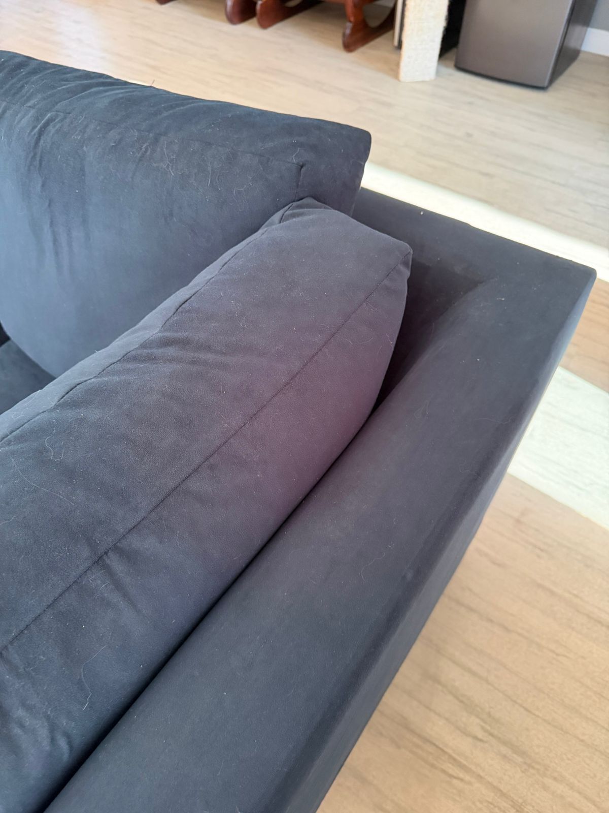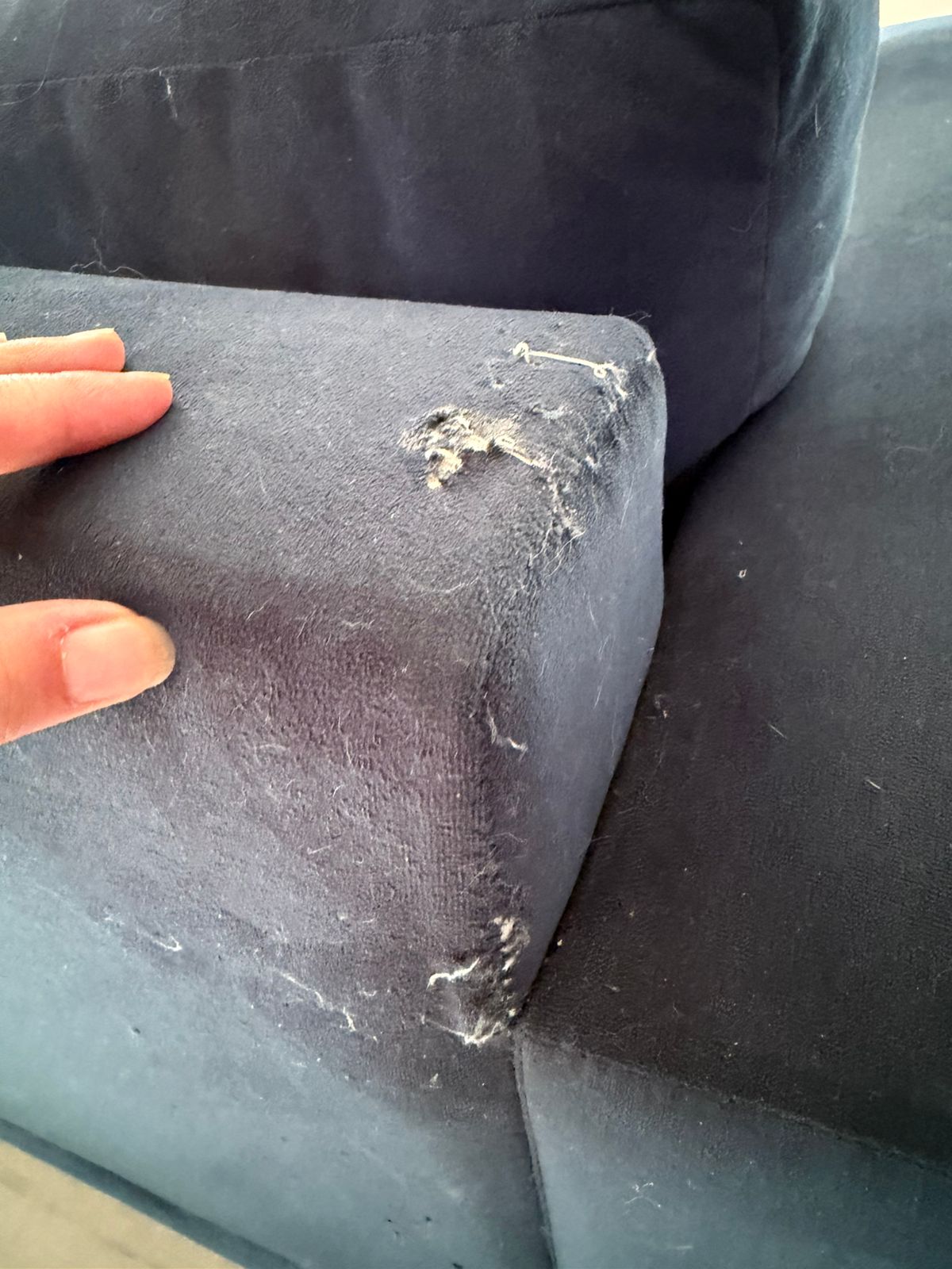 Há uns detalhes do tecido que estão danificados – na ponta do sofá.