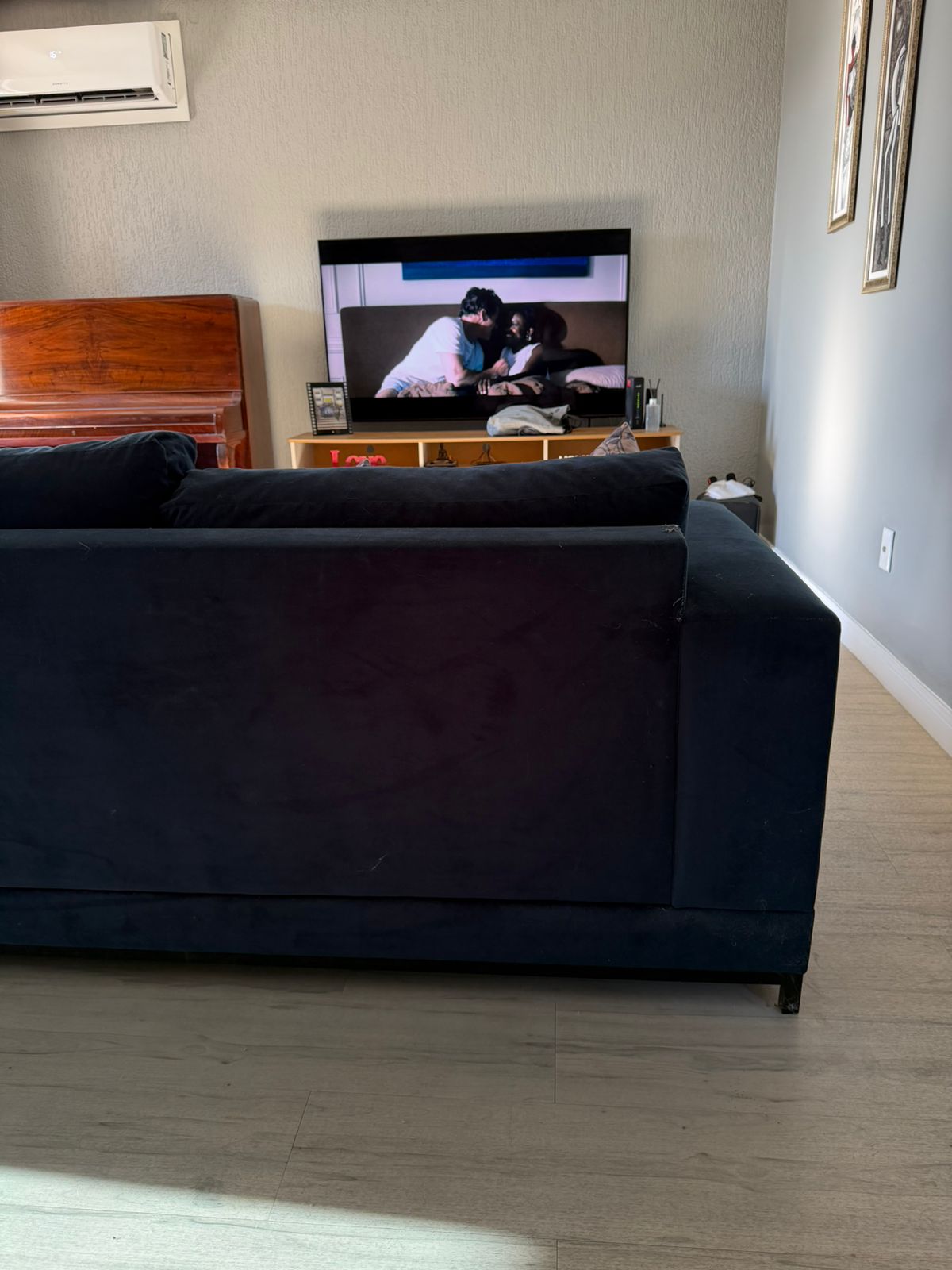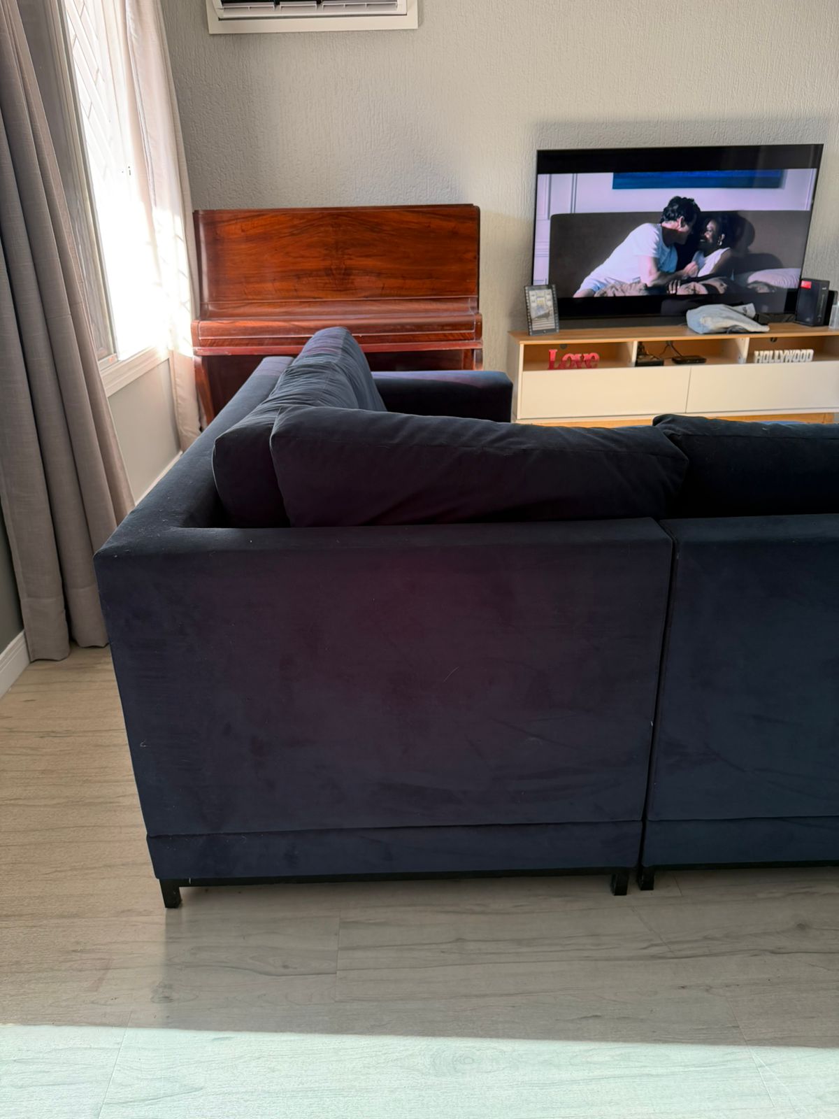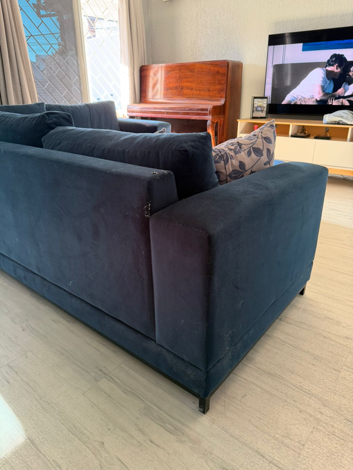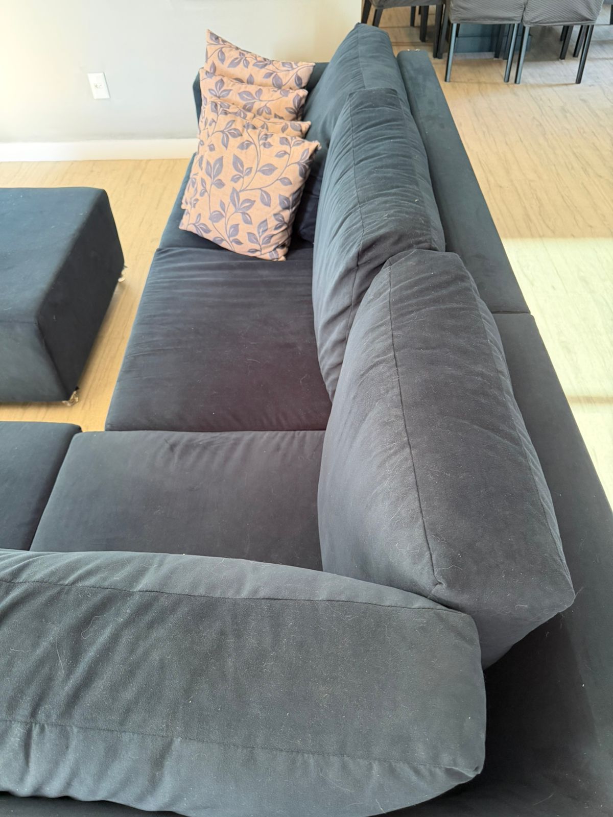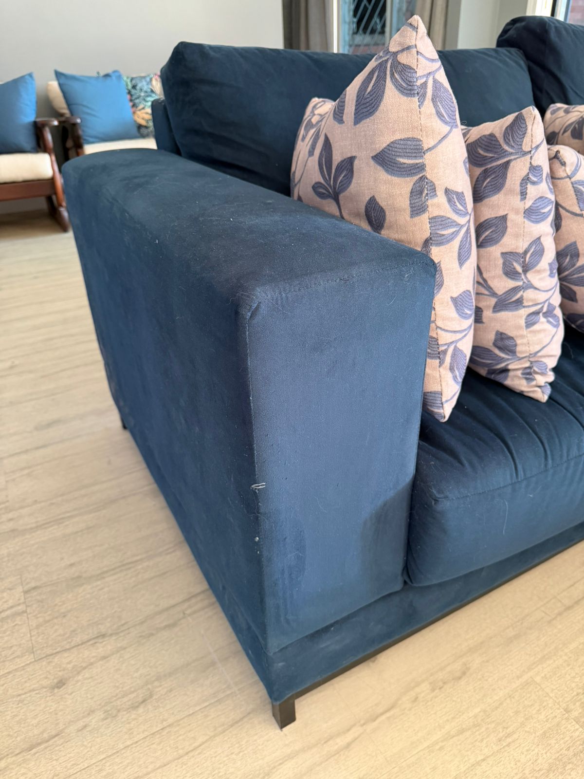 Há uns detalhes do tecido que estão danificados – na ponta do sofá.