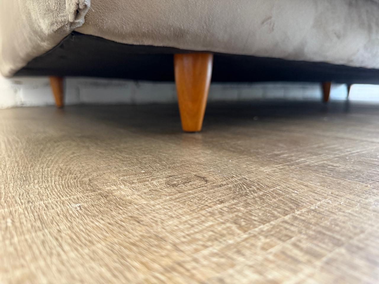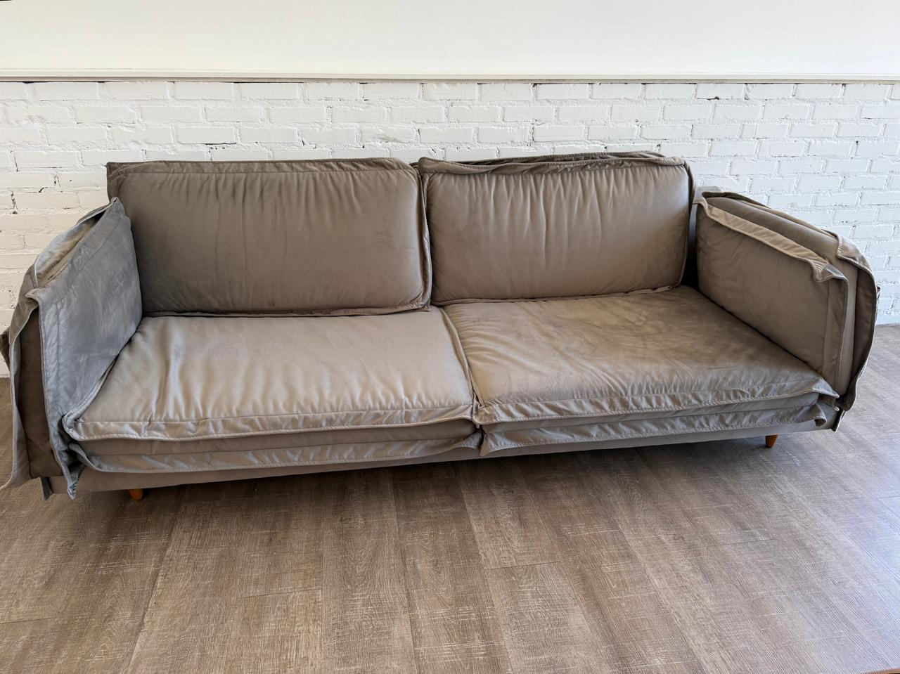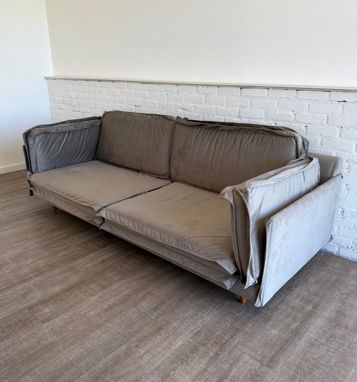 SOFÁ – MODELO BAIXO – AVELUDADO CINZA – BASE E PÉS DE MADEIRA – G060.02