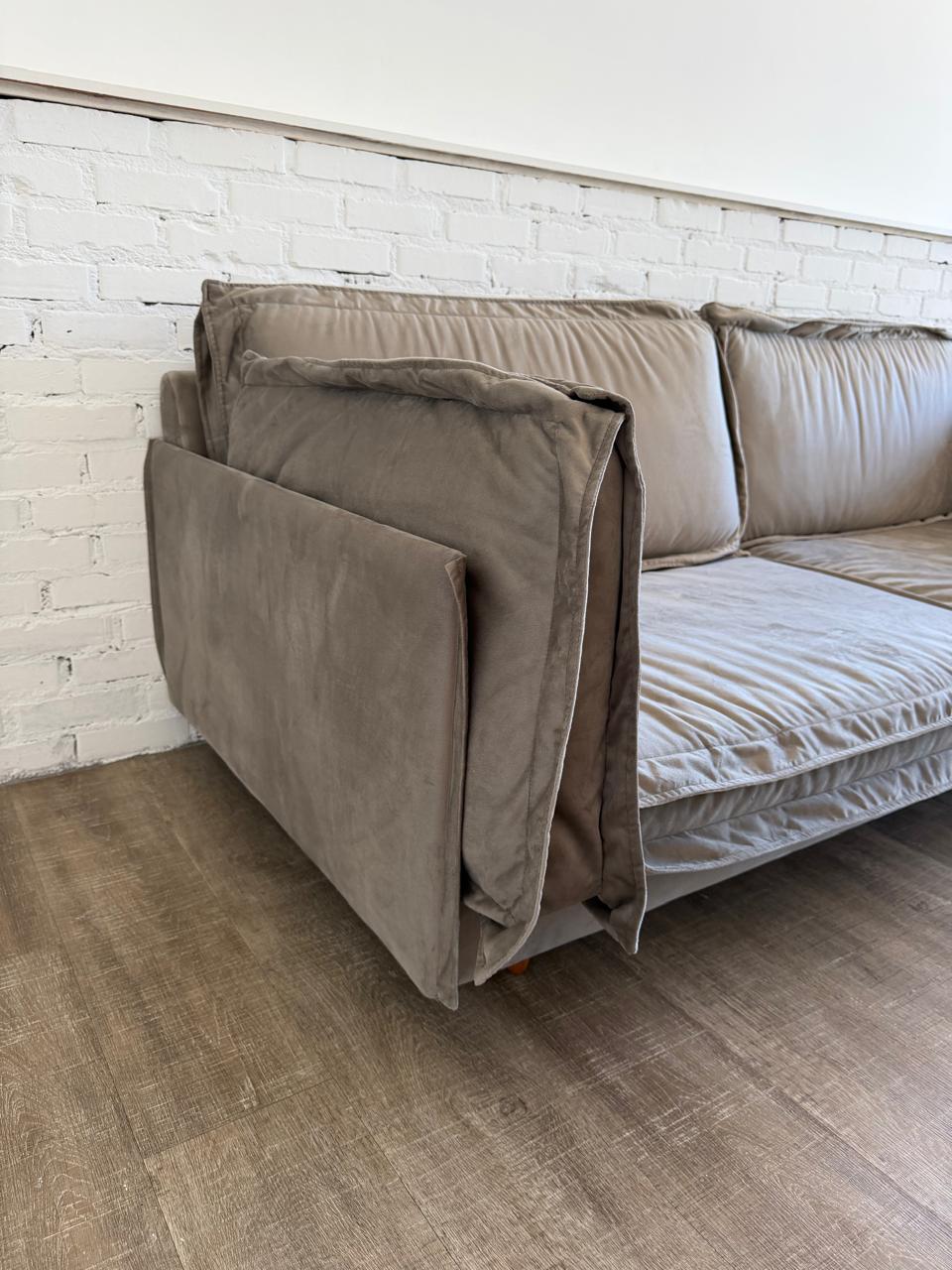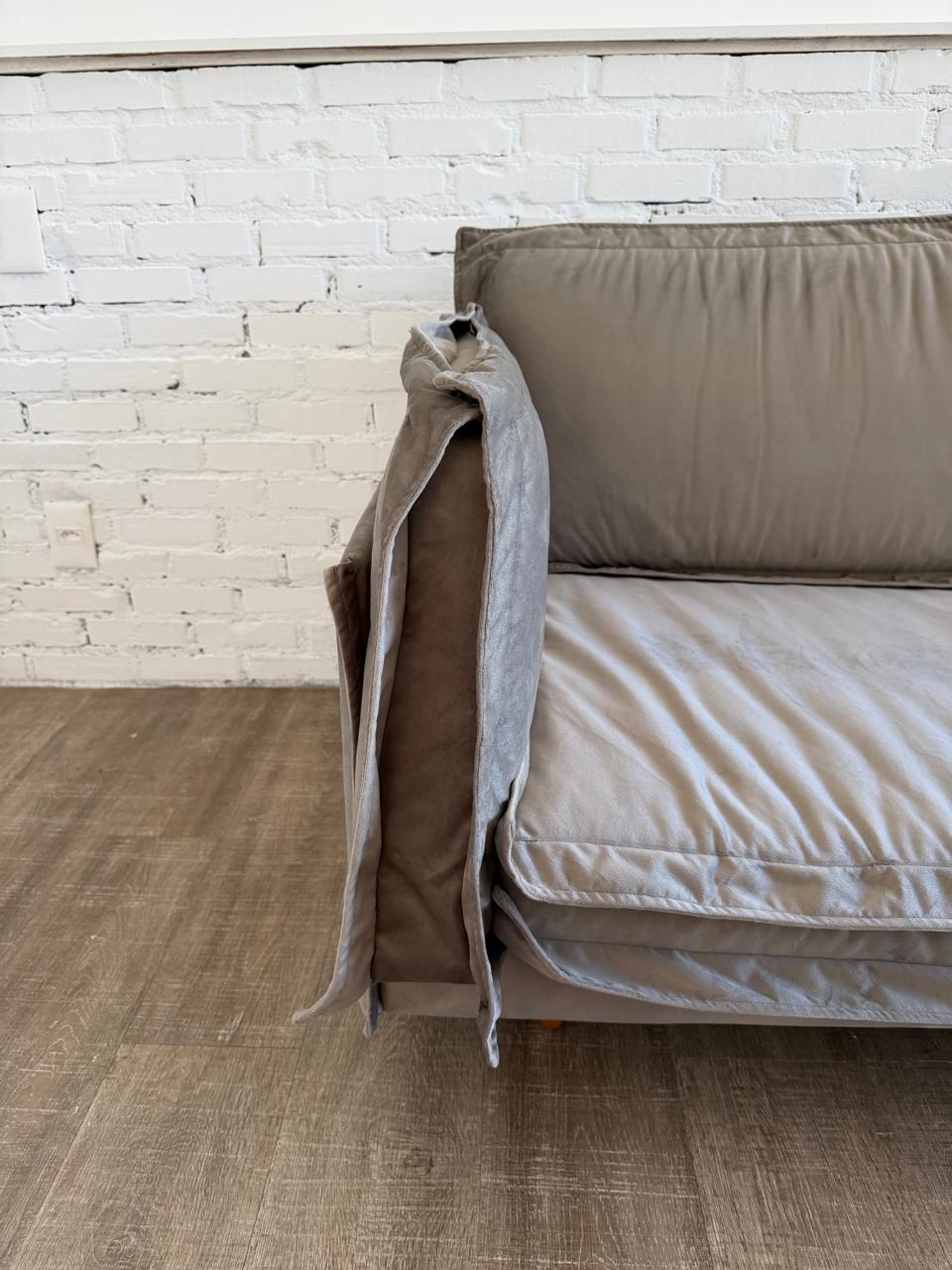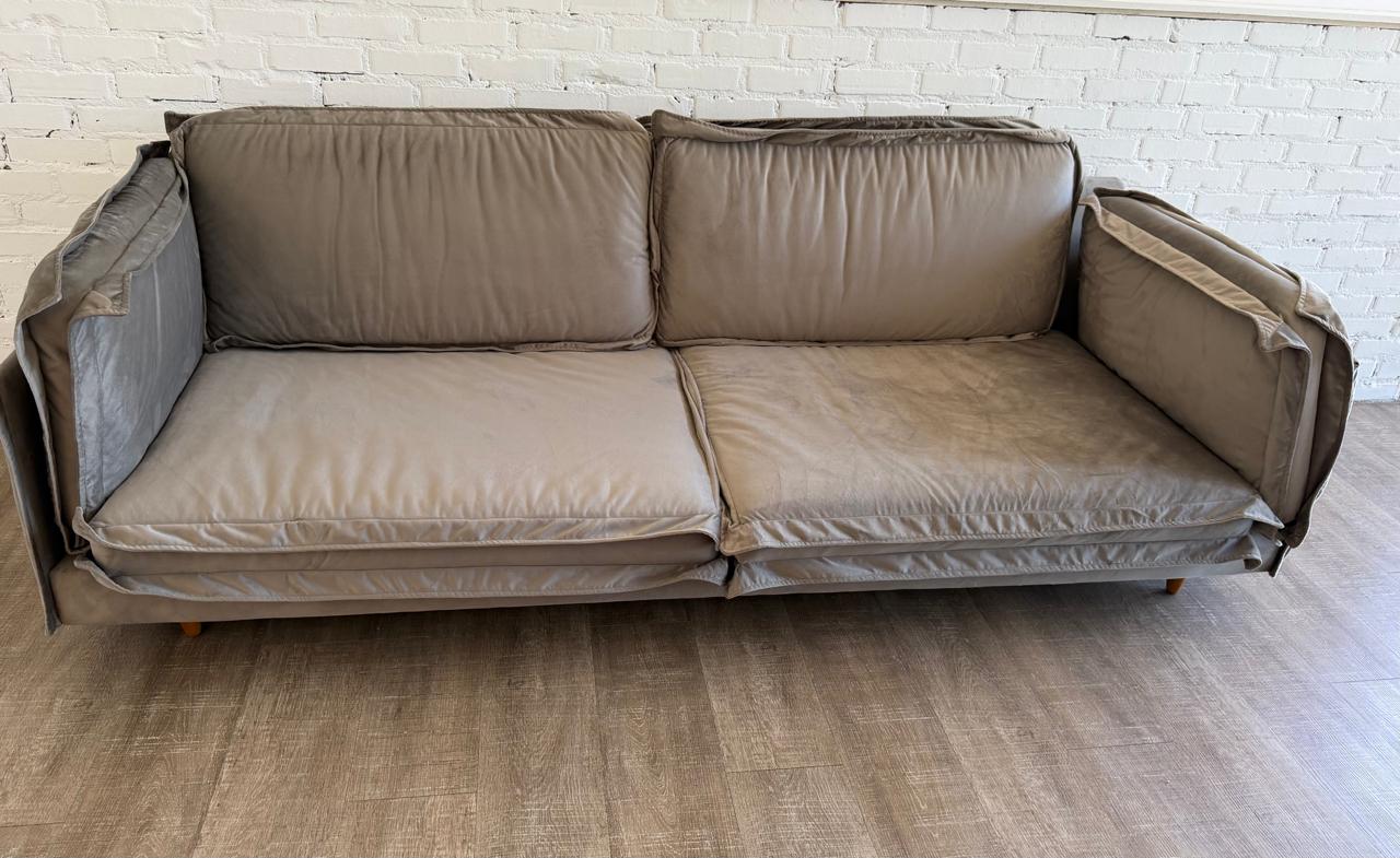 SOFÁ – MODELO BAIXO – AVELUDADO CINZA – BASE E PÉS DE MADEIRA – G060.02