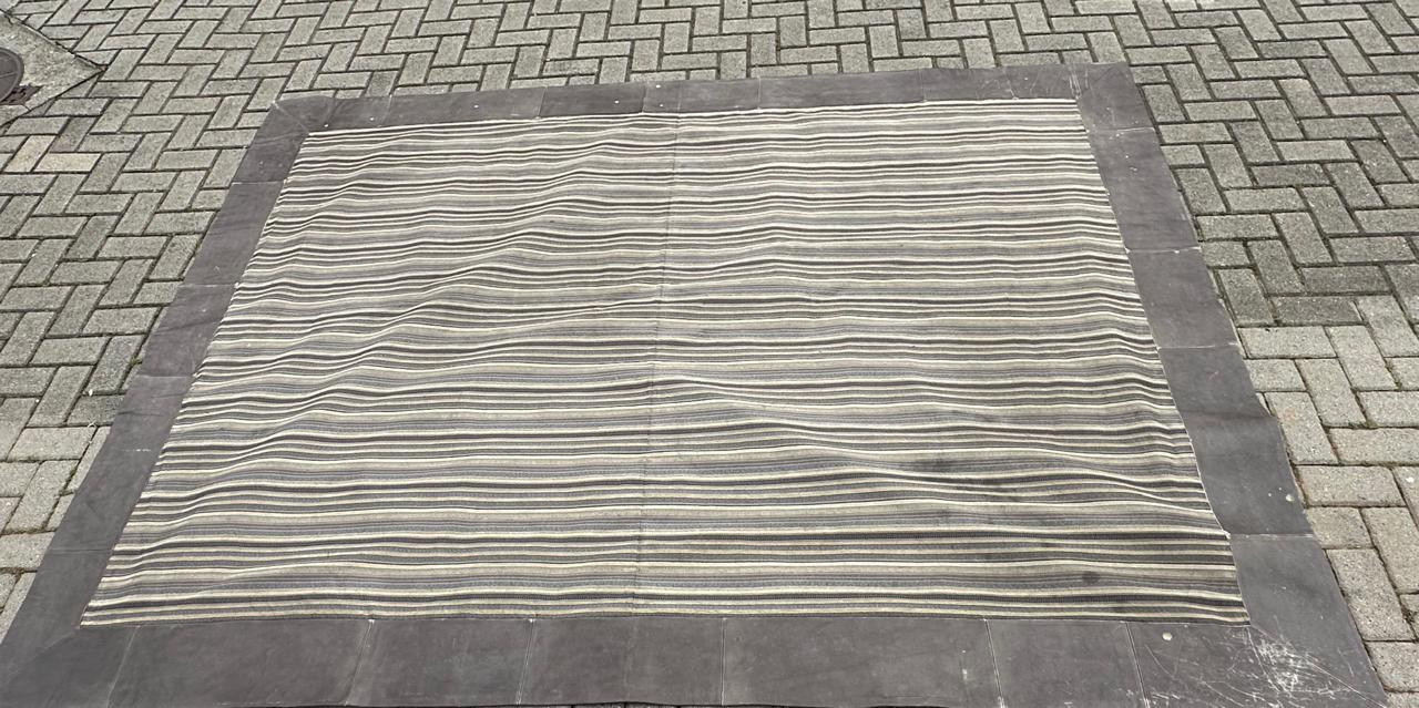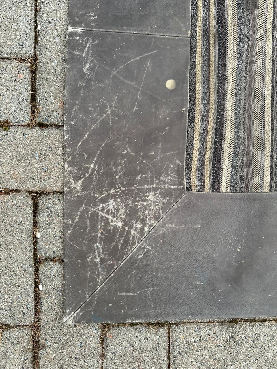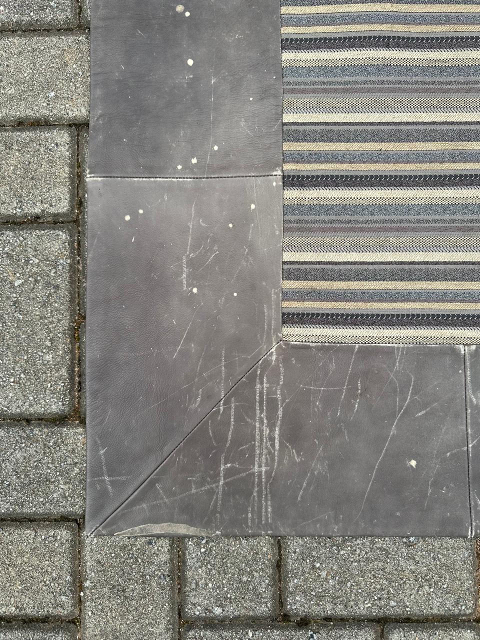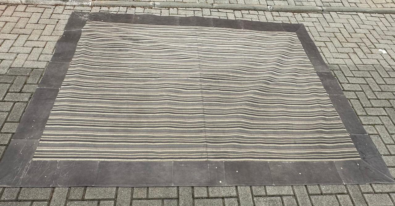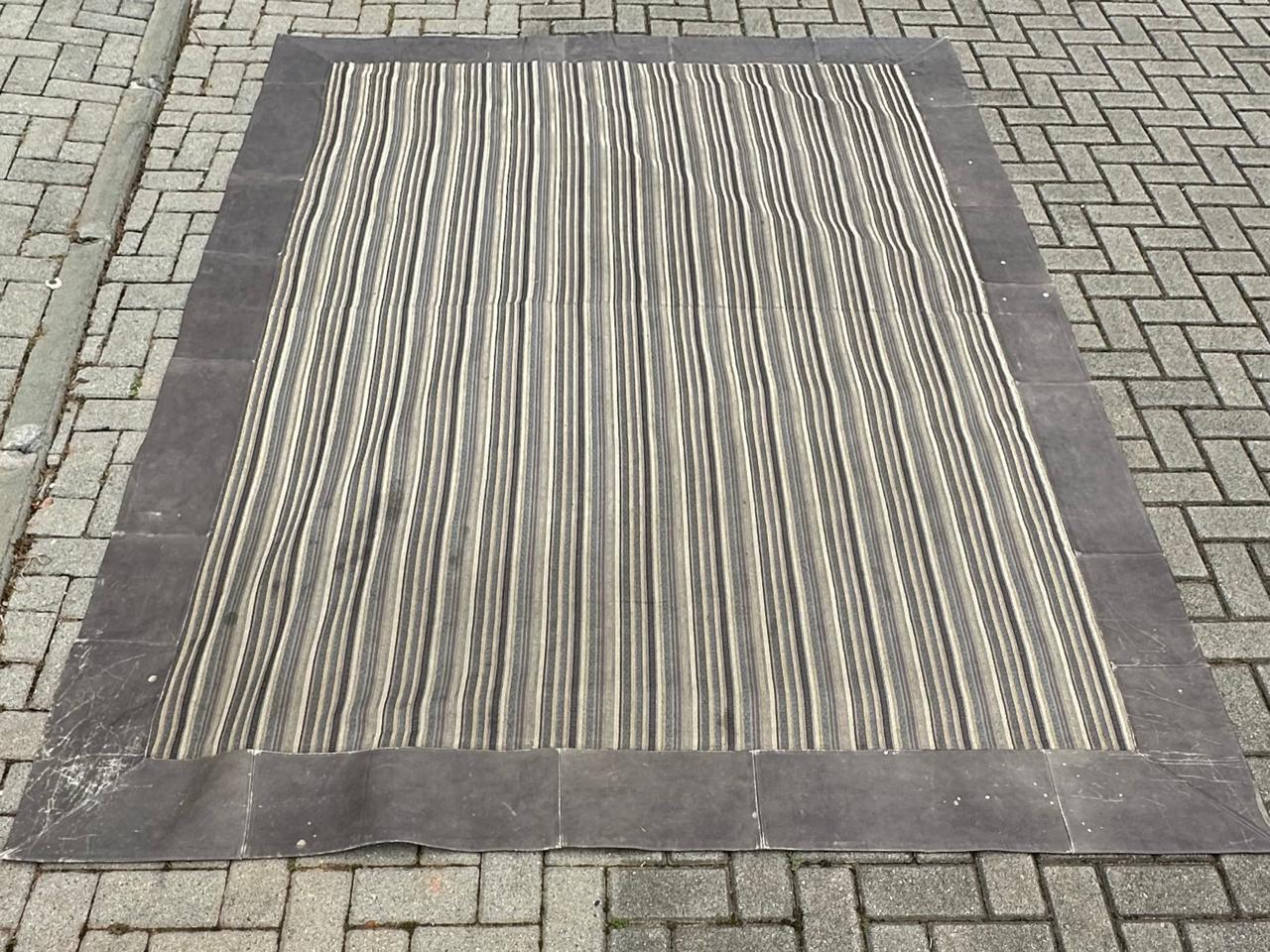 TAPETE – TECIDO + BORDA EM COURO NATURA – MARCAS DE USO E ALGUMAS MANCHINHAS NO COURO – NO TECIDO, PRECISA HIGIENIZAÇÃO – PEÇA DE QUALIDADE, MAS CASA COM CRIANÇA TAMBÉM DE QUALIDADE ! — A002.200