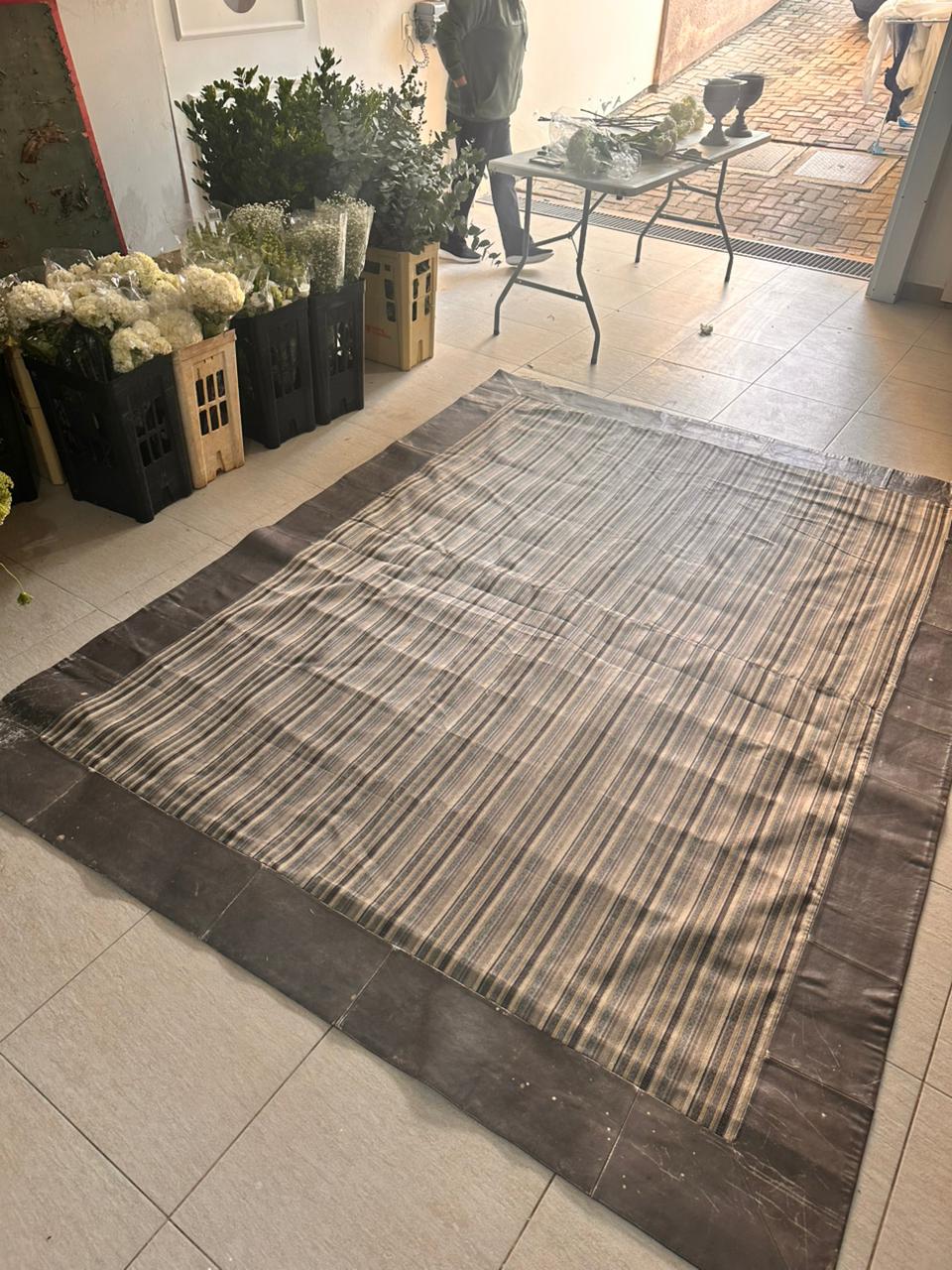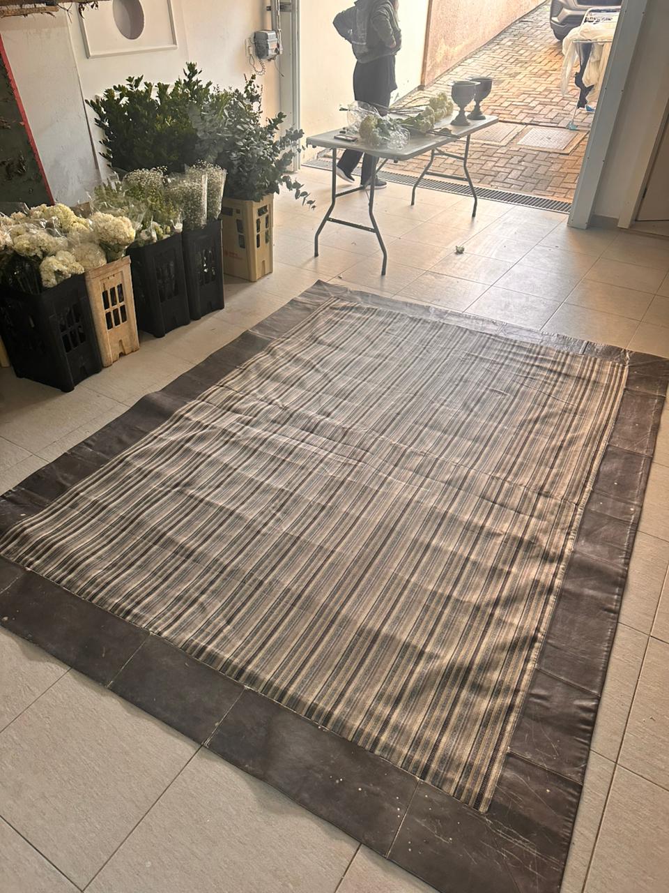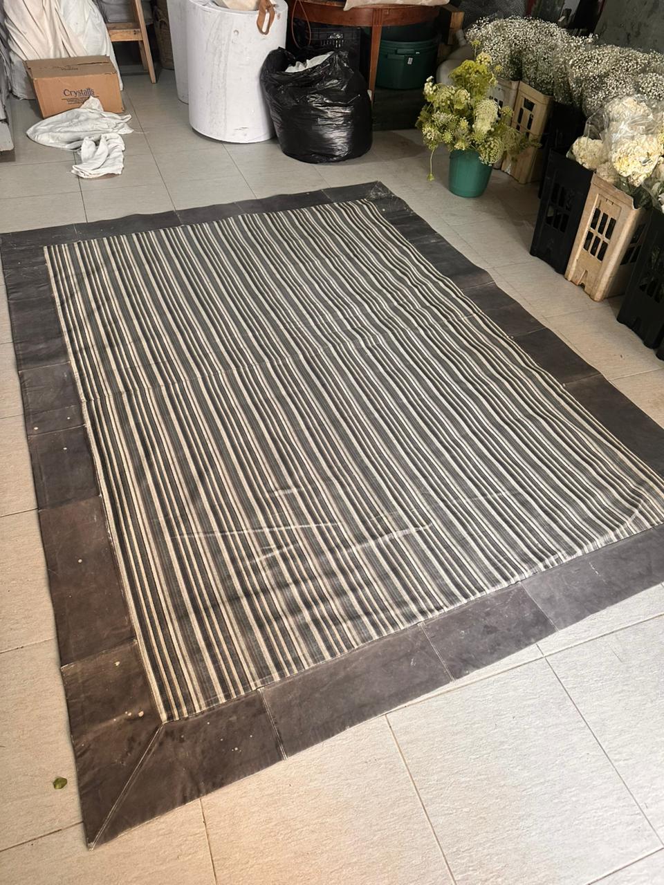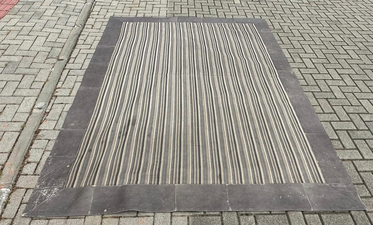 TAPETE – TECIDO + BORDA EM COURO NATURA – MARCAS DE USO E ALGUMAS MANCHINHAS NO COURO – NO TECIDO, PRECISA HIGIENIZAÇÃO – PEÇA DE QUALIDADE, MAS CASA COM CRIANÇA TAMBÉM DE QUALIDADE ! — A002.200